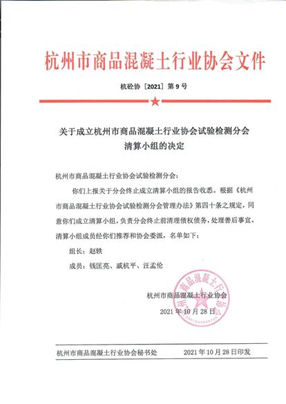 关于成立杭州市商品混凝土行业协会试验检测分会清算小组的决定