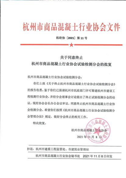 关于同意终止杭州市商品混凝土行业协会试验检测分会的批复